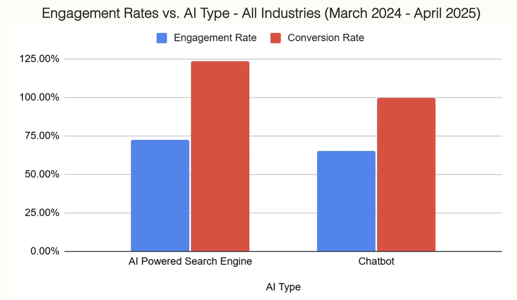 The chart below shows engagement rates and conversion rates for the three studied industries. While tourism is seeing very similar results for each traffic source, the services industry is seeing a higher engagement rate for traditional search and, somewhat counterintuitively, a higher conversion rate for AI, and education is seeing better results from AI as a whole.